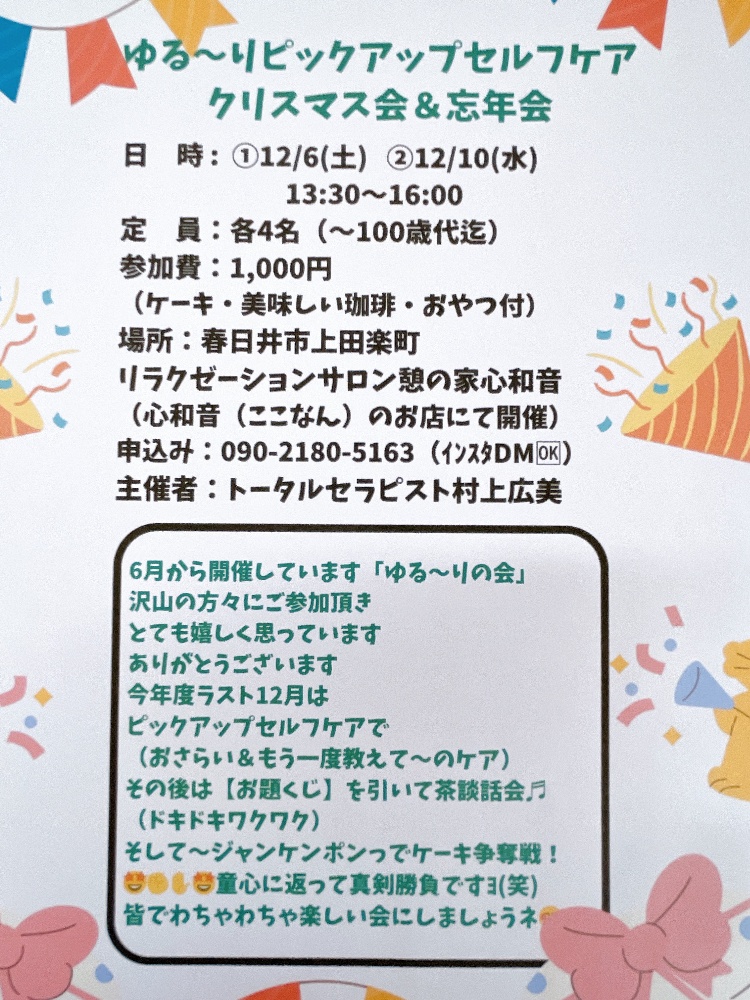 秋めいて来ましたね♬皆さまいかがお過ごしでしょうか(^^)心和音店主は元気いっぱいでございます(笑)さて今年ラストのゆる~りの会ご案内です😊ちょっぴり早めですがクリスマス&忘年会を兼ねた楽しい会を開催します。今回は4名参加で募集です♪すぐいっぱいになりますので行きたいな~の方心和音に行ったことないけど~どんな店主さんなんだろ?と思っている方。大丈夫です笑⇈に書いた通り元気いっぱいの店主ですから~(≧▽≦)お問合せ&ご予約お待ちしていますねお気軽にです🥀