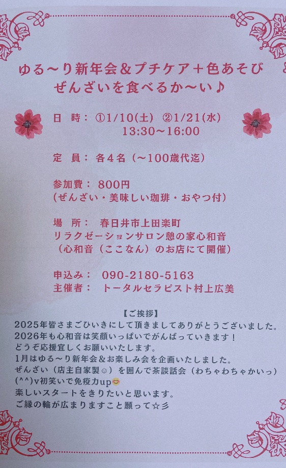 皆さまこんにちは♪早いもので今年も残すところあと1か月ちょっと😊ゆる~りの会は今年の6月より開催し大盛況で店主も本当に嬉しいです♬来年も参加者さまも主催のわたくしも無理ないところで楽しく免疫力upしていけたらいいな~と考えております(^^)で、来年2026年1月は新年会兼ねて楽しい会を企画いたしました!下記の写真にてご案内しておりますので宜しければご参加くださいね🌺お問合せ&ご予約お待ちしています☺(2025.11.12より募集☆心和音店主🥀)